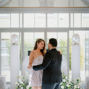 Modern style flowers were created in stylish white acrylic pots, seated on white plinths to frame the bride and groom.